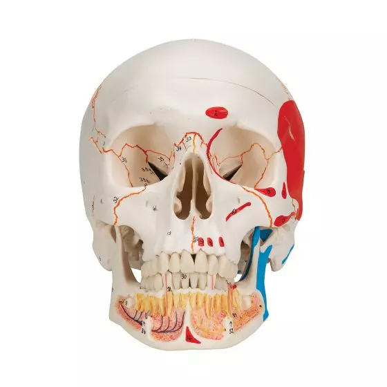 This Classic Human Skull model with Opened Lower Jaw has open mandible shows tooth roots, vessels and nerves.