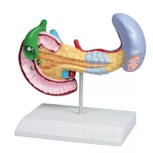 Cut away view of the duodenum, caecum and rectum.The transverse colon and anterior stomach wall are removable. Mounted on stand.