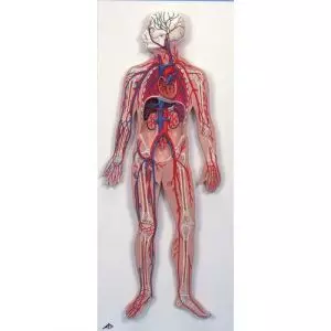 The front heart wall can be removed to show the inner structures in detail. All important structures are present such as ventricles, atriums, aortic, mitral, pulmonary and tricuspid valves. Heart muscle, fatty tissue, arteries and veins are painted in detail, the structures are shown on the educational card (German/English). The model is made of unbreakable plastic and removable from the stand.