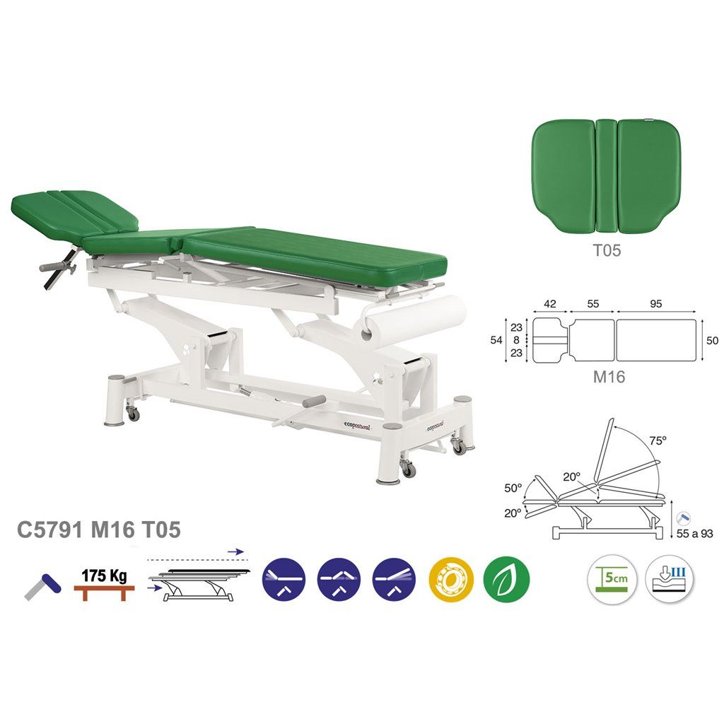 The Multi-functions Hydraulic Massage Table Ecopostural C5791 in 3 parts with an hydraulic height adjustment operated by foot pump. Its steel frame with white epoxy powder coating heated at 250º is equiped with a frontal piece with high resistance polypropylene curved feet and a lateral piece.